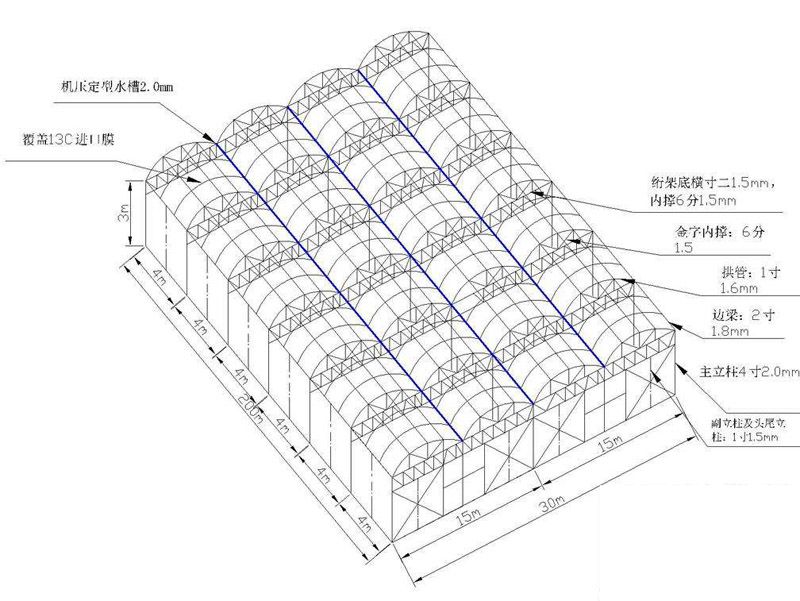 溫室跨度:20.0m/12.0m/10.8m/9.6m/8.0m(溫室規格可根據用戶實際需求進行設計)